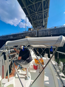 We came up to a railroad bridge that we weren't expecting and from afar, it looked extremely low so we called the bridge tender to verify the clearance and learned that we had plenty of room so we continued on.